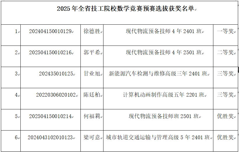 本次竞赛共有数十名学生参与,经过激烈角逐,最终评出一、二、三等奖及优胜奖若干。其中,徐德胜、郭平希、甘业旭、陈廷柏等4名同学凭借扎实的数学功底与出色的临场表现脱颖而出,成功获得晋级2025年全省技工院校数学竞赛的资格。