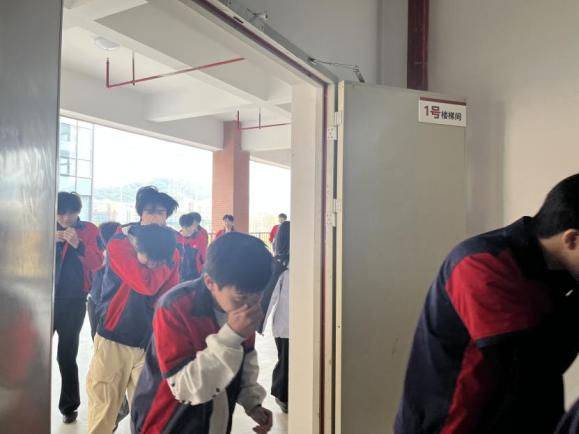 12月30日上午9时35分,演练正式开始。警报响起后,各班级、办公室师生迅速响应,按预定疏散路线有序撤离。各楼层责任教师及时到位,在楼梯口、转角处等位置规范引导、维持秩序;学生严格遵守“弯腰、捂口鼻、靠右行”要求,沿指定路线快速疏散,全程无拥挤、推搡,路线清晰、行动迅速。
