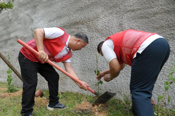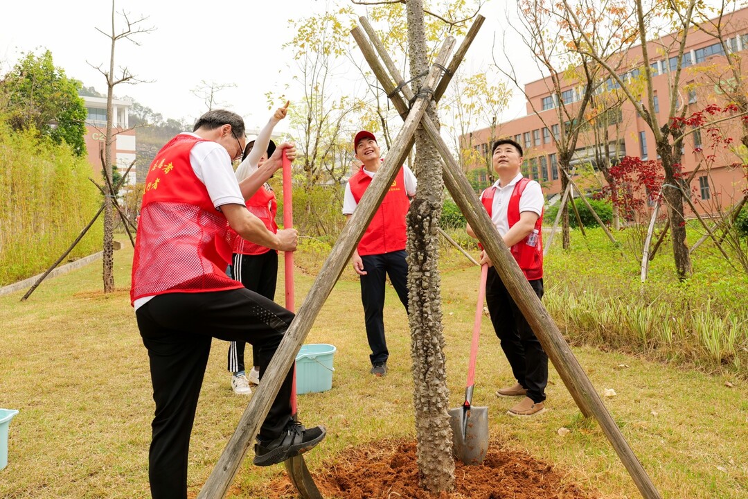 铁锹翻土、扶苗填坑、提水浇灌……植树现场热火朝天。师生代表携手种下象征坚韧品格的荔枝树,寓意“十年树木,百年树人”;工会会员代表则投身于往年捐赠树木的养护工作,拿起工具为“老朋友”除草、松土、浇水,为绿意延续贡献力量;炮仗花苗在师生协作下扎根土壤,火红的花簇预示着学院事业蒸蒸日上。一锹土、一瓢水,饱含对绿色未来的期许,更彰显了交通人扎根教育、深耕行业的初心。